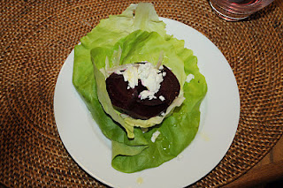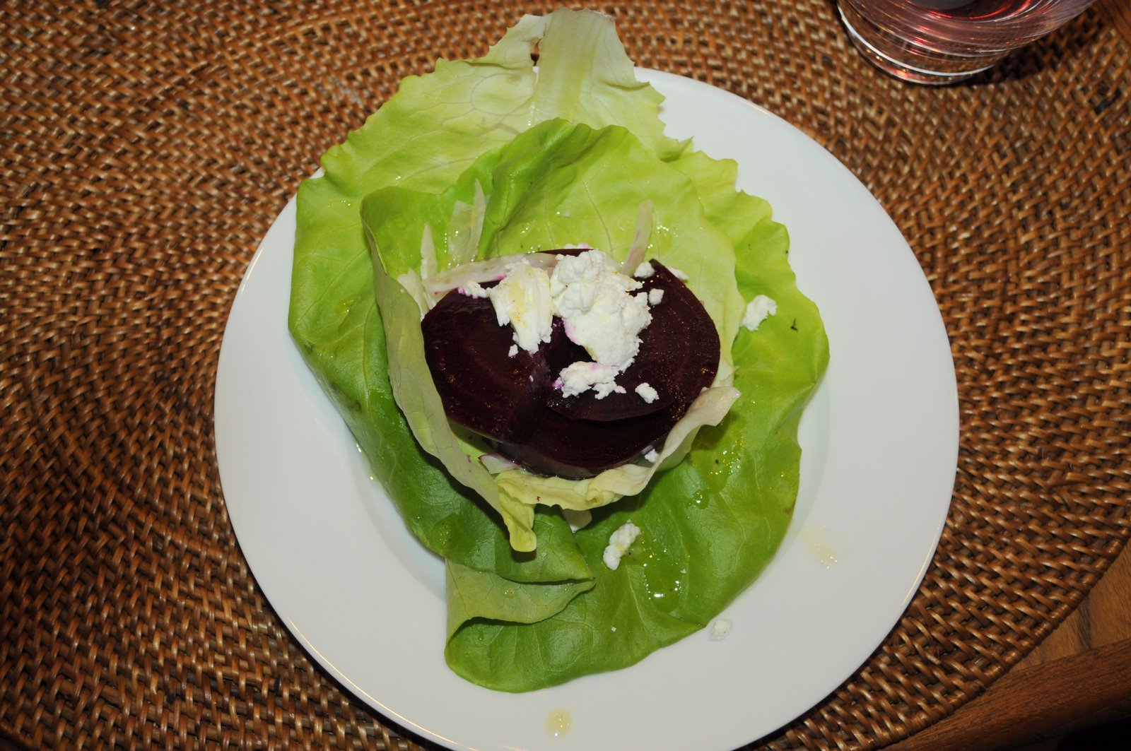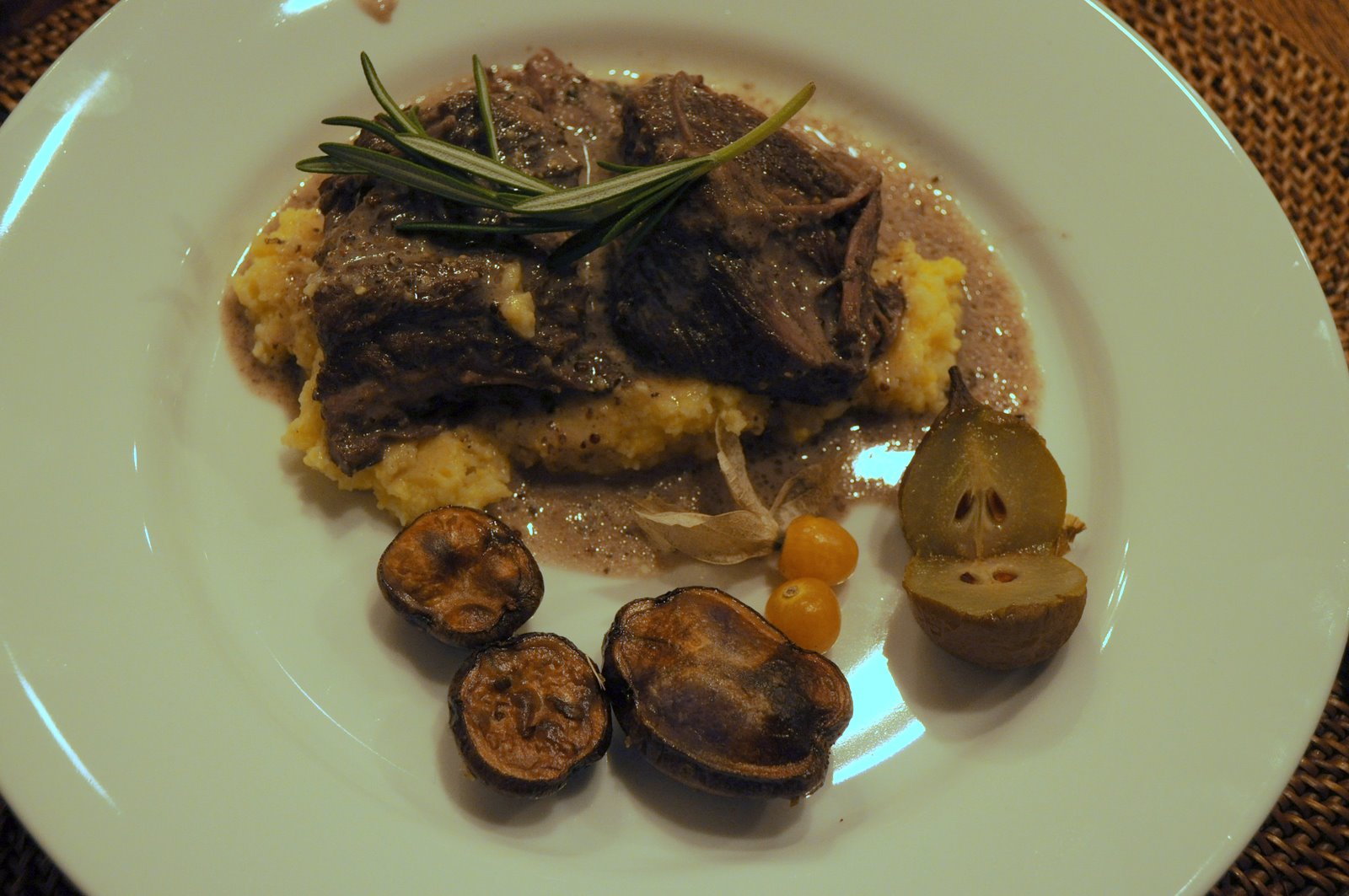 Red wine braised beef short ribs, purple potatoes, roasted pear and gooseberries.