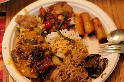 My plate, as I don’t hold back. Clockwise from utensils: patatim pancit (rice noodles with Shiitake mushrooms and pork knuckles), kare-kare (oxtail in peanut sauce), lumpiang hubad (vegetables and peanut sauce), morcon (stuffed beef), lumpiang shanghai (pork spring rolls).