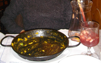 Two old balding men ran the show, but the clientele were the ones who starred in it. It was apparent that mostly tourists frequented the establishment because each item on their menu had very accurate photographs of the dishes but didn’t have an English translation. The help staff will very gently speak to you in Spanish and expect that you will eventually catch on and understand. Two slot machines were often in use by white-haired men in old-fashioned trousers, and during one’s meal one would be serenaded by the sound of coins and a recorded voice saying ?Uno, dos, tres! Premio! Premio!? Middle-aged ladies would laugh loudly while puffing on their cigarettes post-meal, tapping ashes onto empty plates with shrimp heads and mussel shells from the paella which was always a labor of love. ?Paella?veinte cinco minutos?si?? they would ask before sending the order to the kitchen before all others so as to get it started ora mismo.