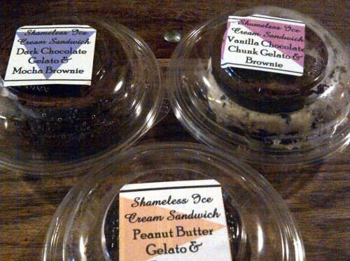 Bierkraft’s sandwich varieties are: peanut butter gelato and brownie, vanilla chocolate chunk gelato on brownie, salt caramel gelato on oatmeal raisin cookie, dulce de leche on pecan brownie, and chocolate gelato on brownie. All are made with Il Laboratorio Gelato.
