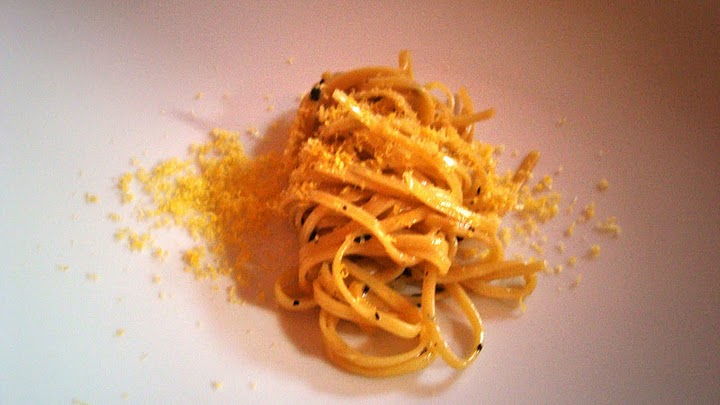 Linguine with goose egg sauce, black mushrooms and grated pickled embryonated chicken egg.