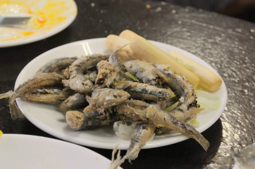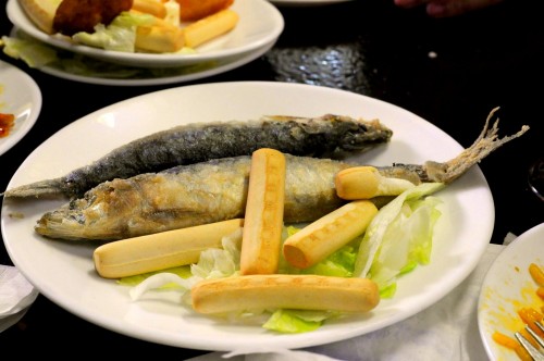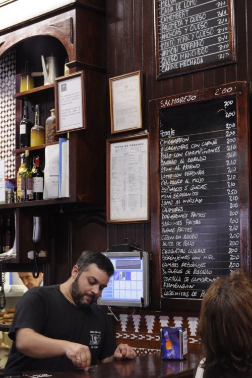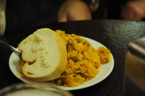 She got us a table in the corner, right in the plain view of our bartender who marked our orders on the bar with a piece of chalk. Pretty soon our round and friendly guy started calling our pack leaders Manolito and Manolita, enthusiastically yelling out our orders “Boquerones!” and “Sardinas!” We began with a 2-Euro plate of paella with a side roll and a couple of glasses of house vino tinto, followed by some fried fish. The boquerones was crispy and tasty and the sardines tasted freshly-caught and its meat was still red with blood. With the help of the rapidly consumed wine, we started laughing, forgetting about the hunger that was just beginning to make us antsy a few minutes prior.