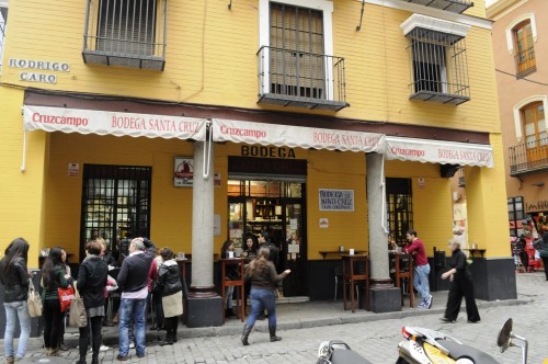A crowd formed outside the restaurant called Bodega Santa Cruz in Seville at noon. We just arrived after a two-hour drive from Malaga and decided that the best thing to do before visiting the sights would be to have lunch. I did not take the buzzing, aggressive crowd placing orders at the bar as inviting, nor did the rest of the group (namely, my sister and her husband). Except that to my wife, a Myers-Briggs ESTP personality (impulsive, charming, live-for-the-moment) who is also a Chinese calendar goat (always in groups), the chaos at Bodega Santa Cruz was the ultimate attraction.