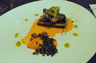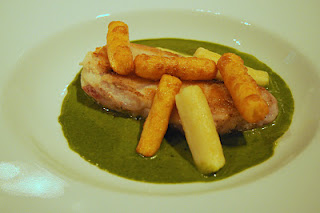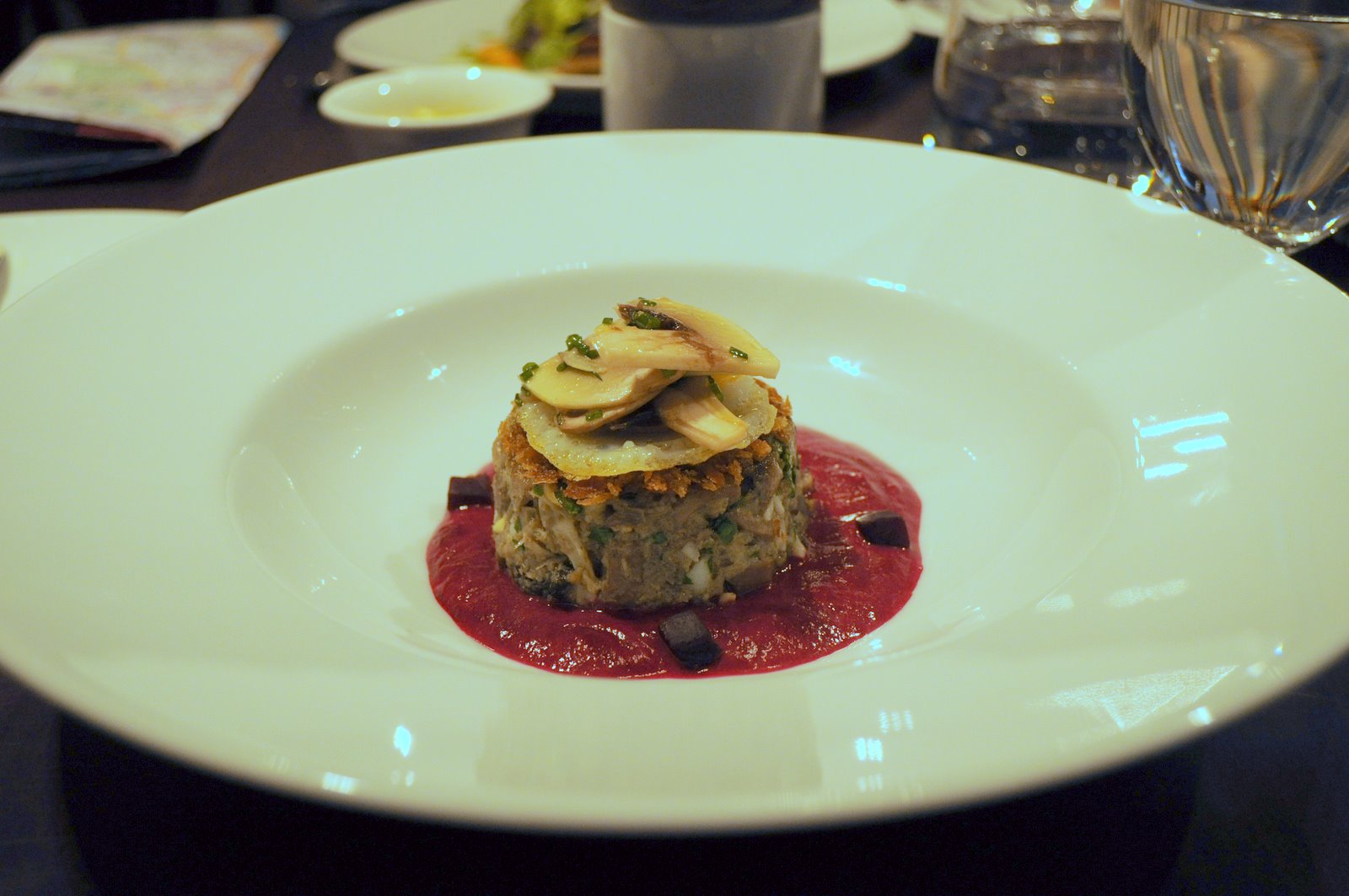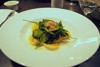 Squash ravioli, spinac, bleu cheese sauce (fantastic), topped with ginger (weird).