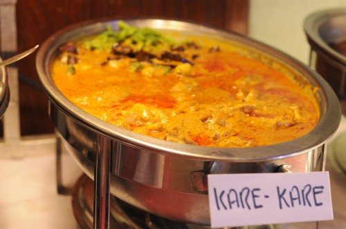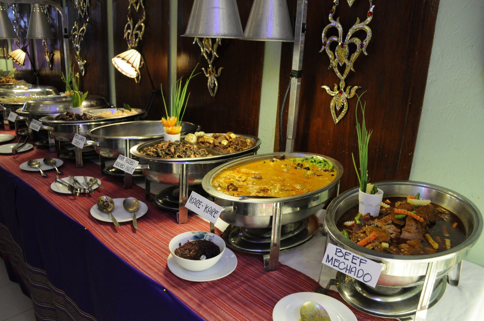 Part of the spread includes kare-kare, beef mechado, and adobo