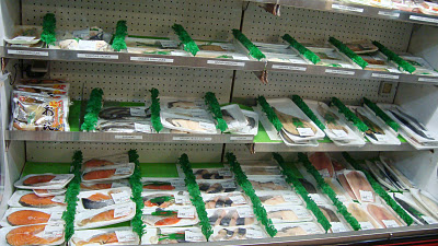 The fish section has individually packed salmon, sardines, and eel. They are packaged in small portions for the convenience of single or small family eaters.
