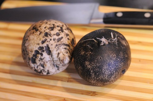 A very slight hint of winter just appeared in the air this morning, and pretty soon you might encounter the black radish (also known as black Spanish, black Spanish round, or in French, Gros Noir d’Hiver) and like I did, wonder what it is. Is it a beet, a radish, a potato, or simply an adventure?