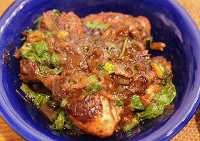 Smother chicken in paste then sear in a hot pan with oil. Add onions, 1/4 cup water and lemon juice and cover, simmering for 30 minutes on low heat. Add cilantro leaves and mix well. Serve with a vegetable side and rice.
