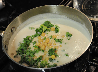Add the remaining chickpeas and some chopped kale. Cook until kale is soft.