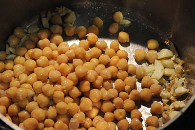 Add all the chickpeas except for one cup (set aside) and season with some spices.