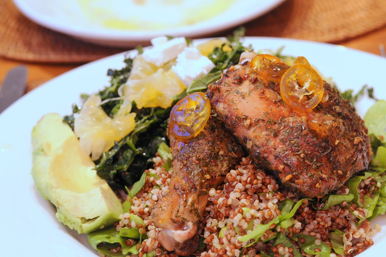 Chimichurri chicken and candied kumquat served over red quinoa, arugula, edamame and bunshimeji mushrooms; kale salad with feta, uglifruit and avocado.