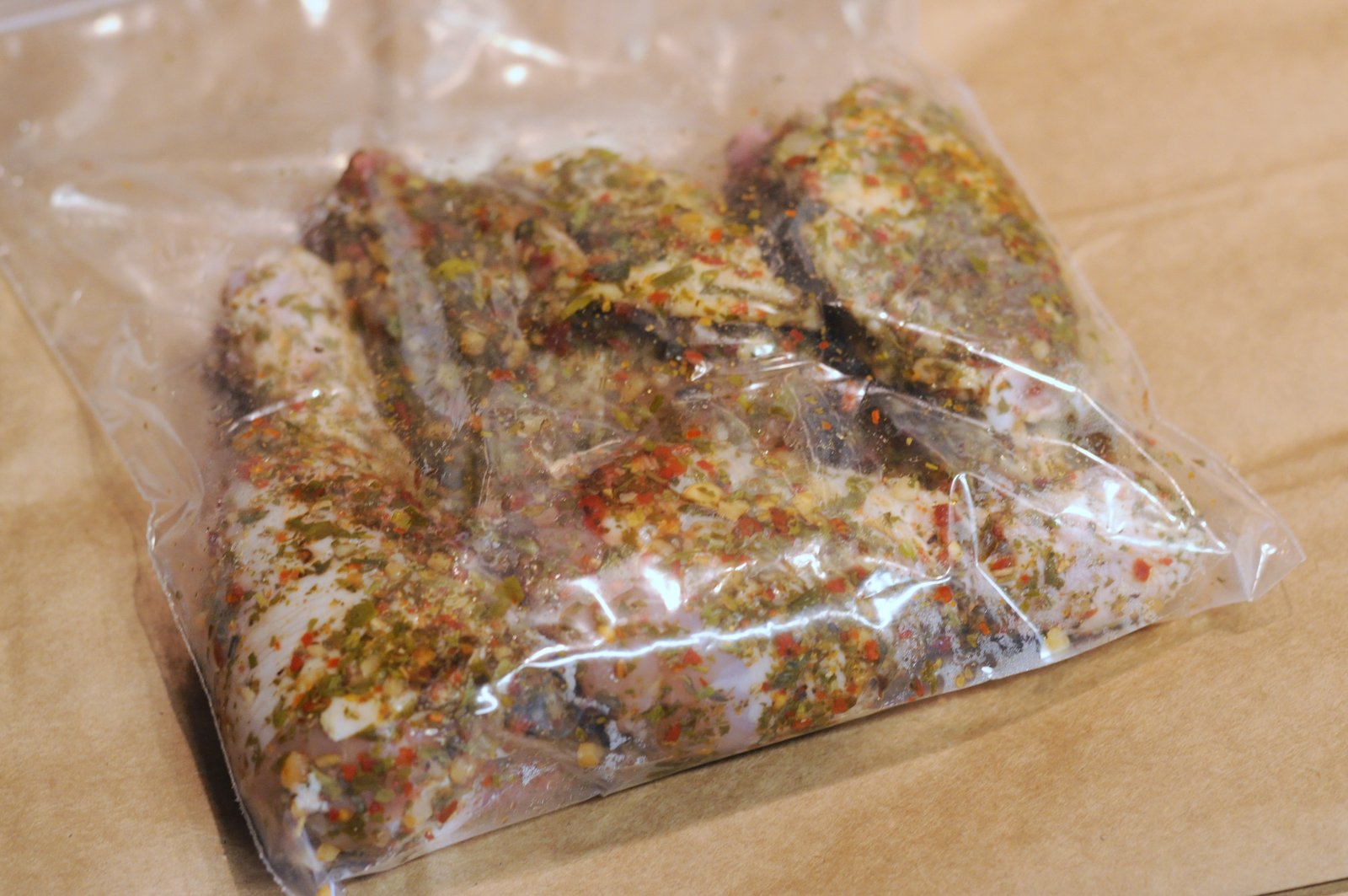 Chicken pieces marinating inside a plastic bag.