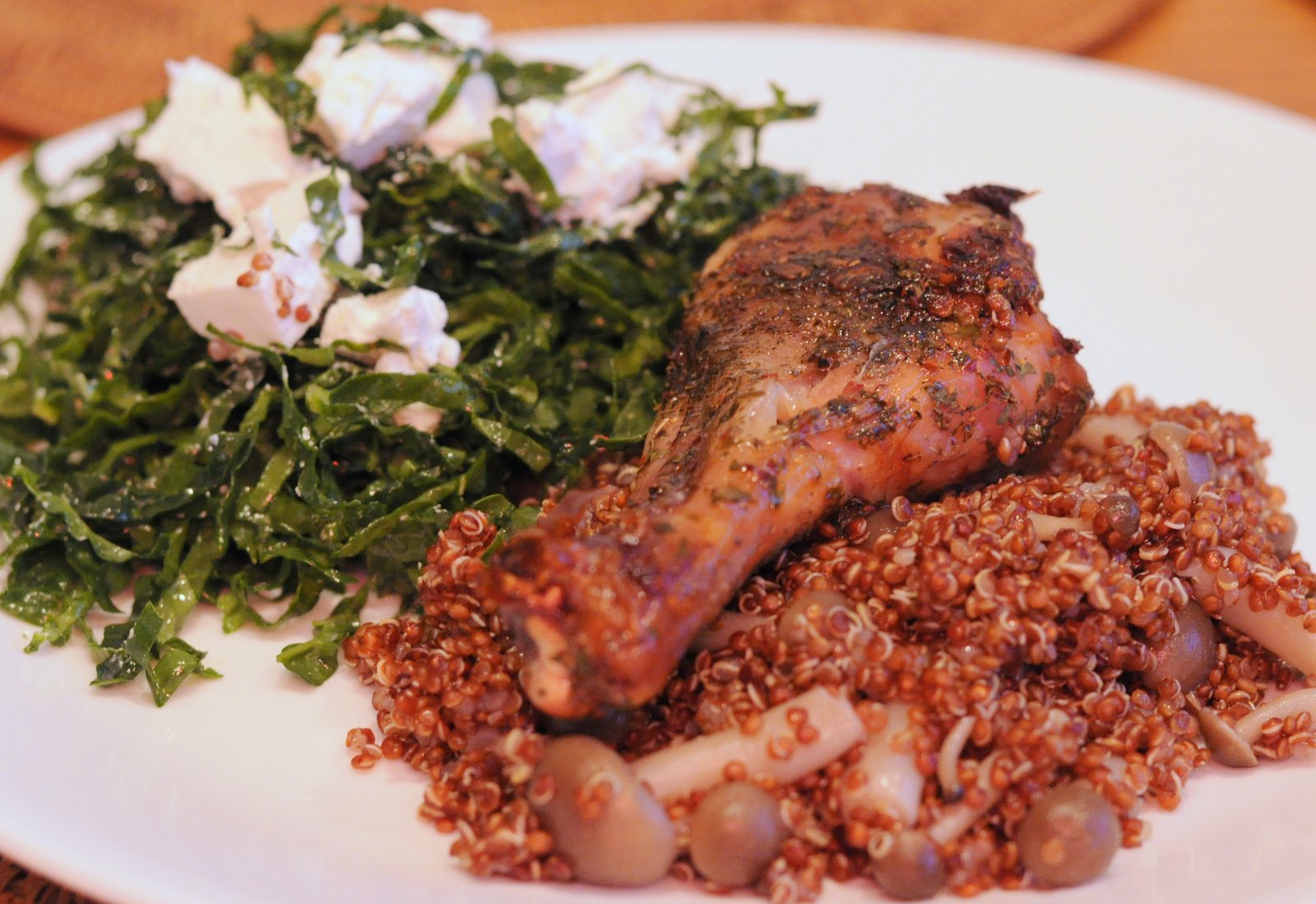 Here served on red quinoa and a side kale salad.