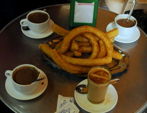 carried cups of chocolate and plates of gigantic churros and we found ourselves a table to share some treats.