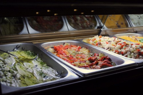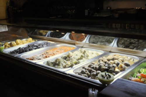 L-R: meatballs, baby squid, artichokes, clams, salad.
