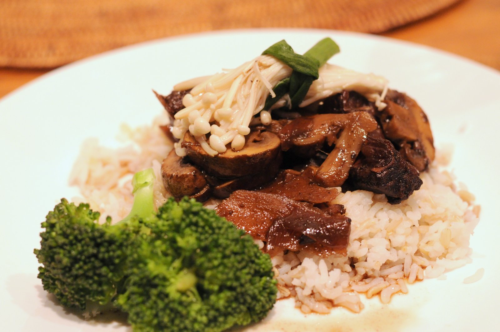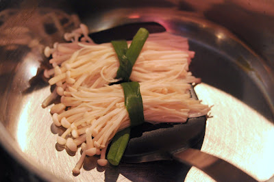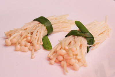 Tie some enoki mushrooms together using a piece of scallion. Cut the roots off if they are still present.