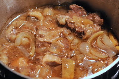 Oxtail, ginger, onion and oyster sauce are simmered in a pot.