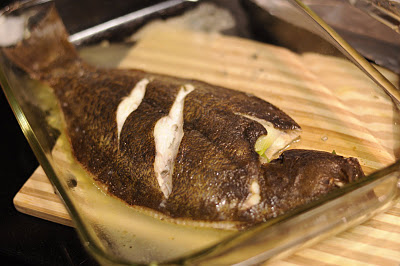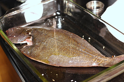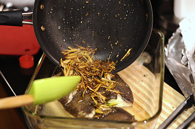 Pre-heat the oven to 400C. Begin by cutting through the meat of the flounder twice with a knife. Don’t go all the way through! Salt the flounder on both sides and drizzling some olive oil on top. Cover with aluminum foil and bake for 20 minutes.
