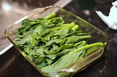While the flounder is baking, cut and arrange choy sum (Chinese broccoli) in a baking dish