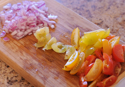 We begin by chopping up some tomatoes and onions. Ripe, unrefrigerated tomatoes work best.