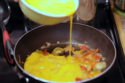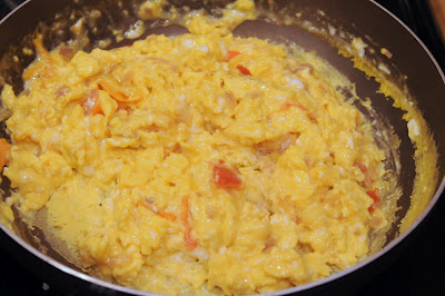 Remove from heat while eggs are still runny. It will continue cooking as it rests.