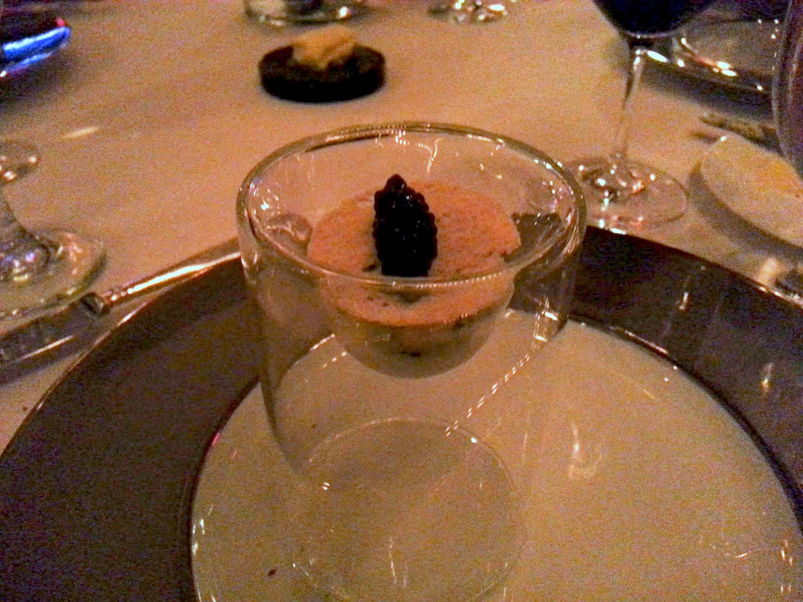 We opted for the tasting menu (called Menu Prestige) on that evening to celebrate over a course of a few hours. Before selections were made we were served an amuse bouche of a warm celery soup shot to start our palates right.