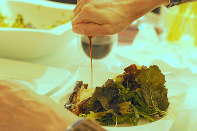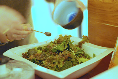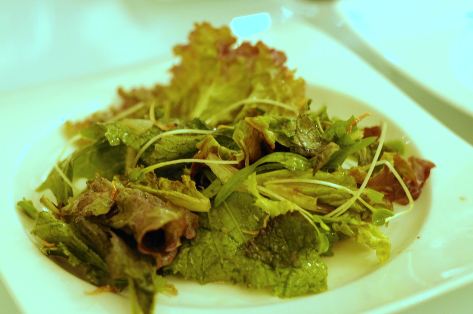 A salad of sprouts, mustard leaves and lettuce drizzled with soy/onion/sesame dressing.