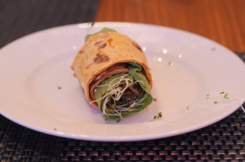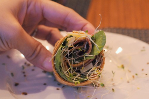 Cheese is melted onto the wrap in an oven, and then it is cut into strips. Fillings such as the above arugula, alfalfa sprouts, and our homemade sopressata are placed on top of the strip.