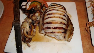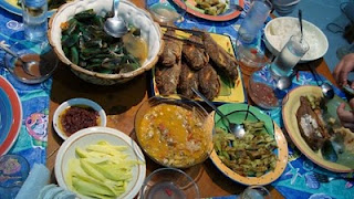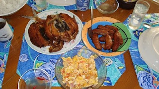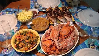 Steamed whole crabs, grilled milkfish, fresh seaweed salad, sauteed oysters and green mangoes with shrimp paste.