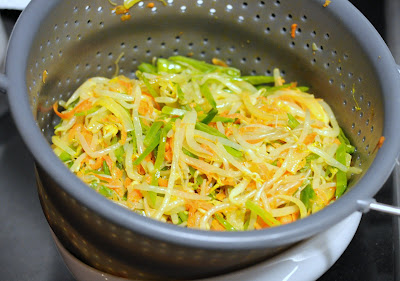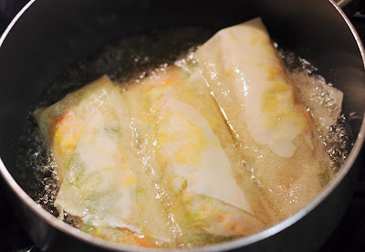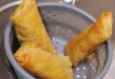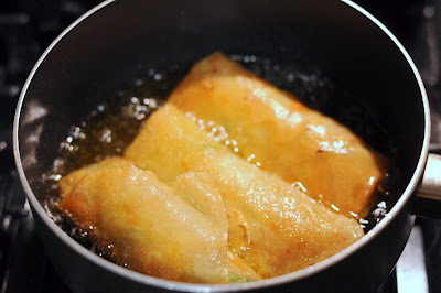 Filipino restaurants fry their lumpia perfectly with a deep-fryer, but I find the filling starchy, having more potatoes than I would like. This recipe has no potatoes, just fresh bean sprouts, carrots and snap peas, sauteed quickly, drained and cooled then wrapped before frying in hot oil.