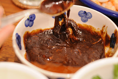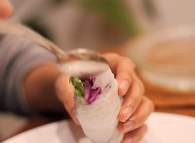 I like biting off one end of the wrapper and spooning the sauces into the roll before