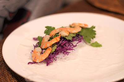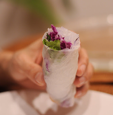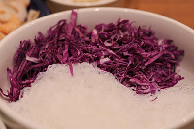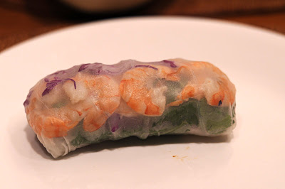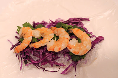 This summer roll contains vermicelli, red cabbage, cilantro and shrimp.