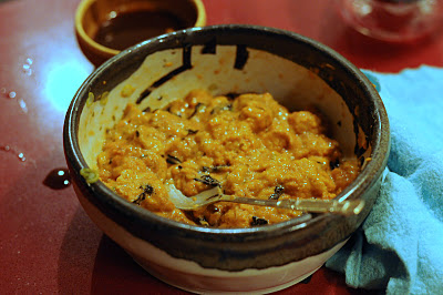 A mixture of sea urchin roe (uni), sake, scallions, seaweed.