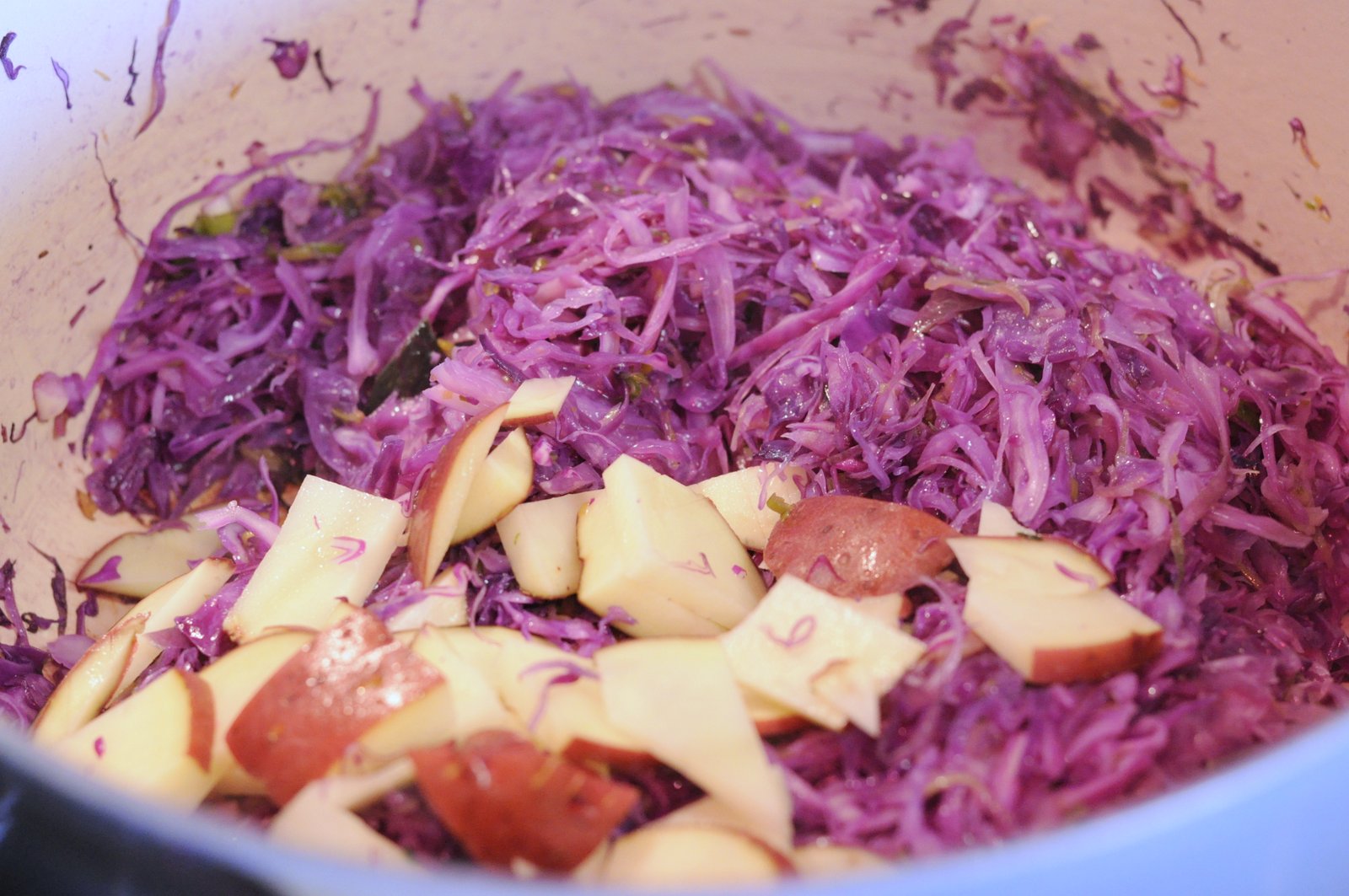 Add potatoes, broth, thyme, sausage. Sauté for a few minutes and then add the broth.