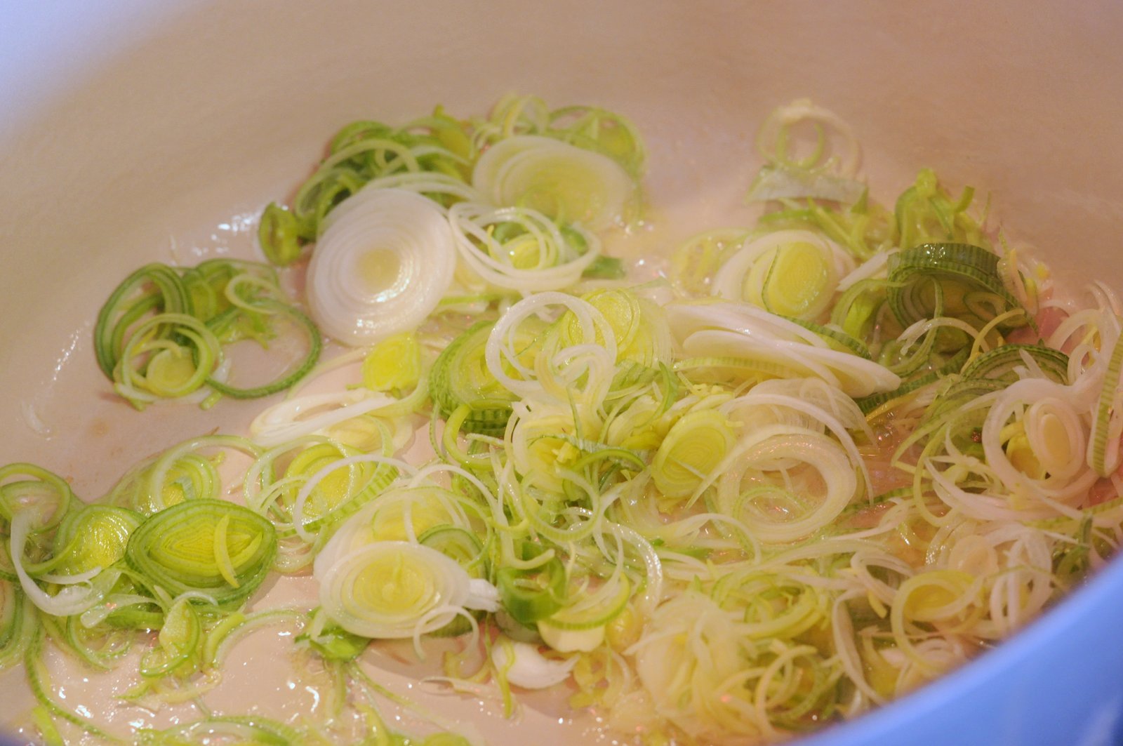 Sauté the leeks and cook until soft and golden around the edges, add the cabbage and cook until caramelized, about 10 minutes. Stir in potatoes, stock and thyme. Simmer for about an hour until potato falls apart. Add more water, as needed, to reach the desired consistency. Season with black pepper and serve, topped with cheese. Serves four.