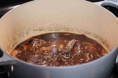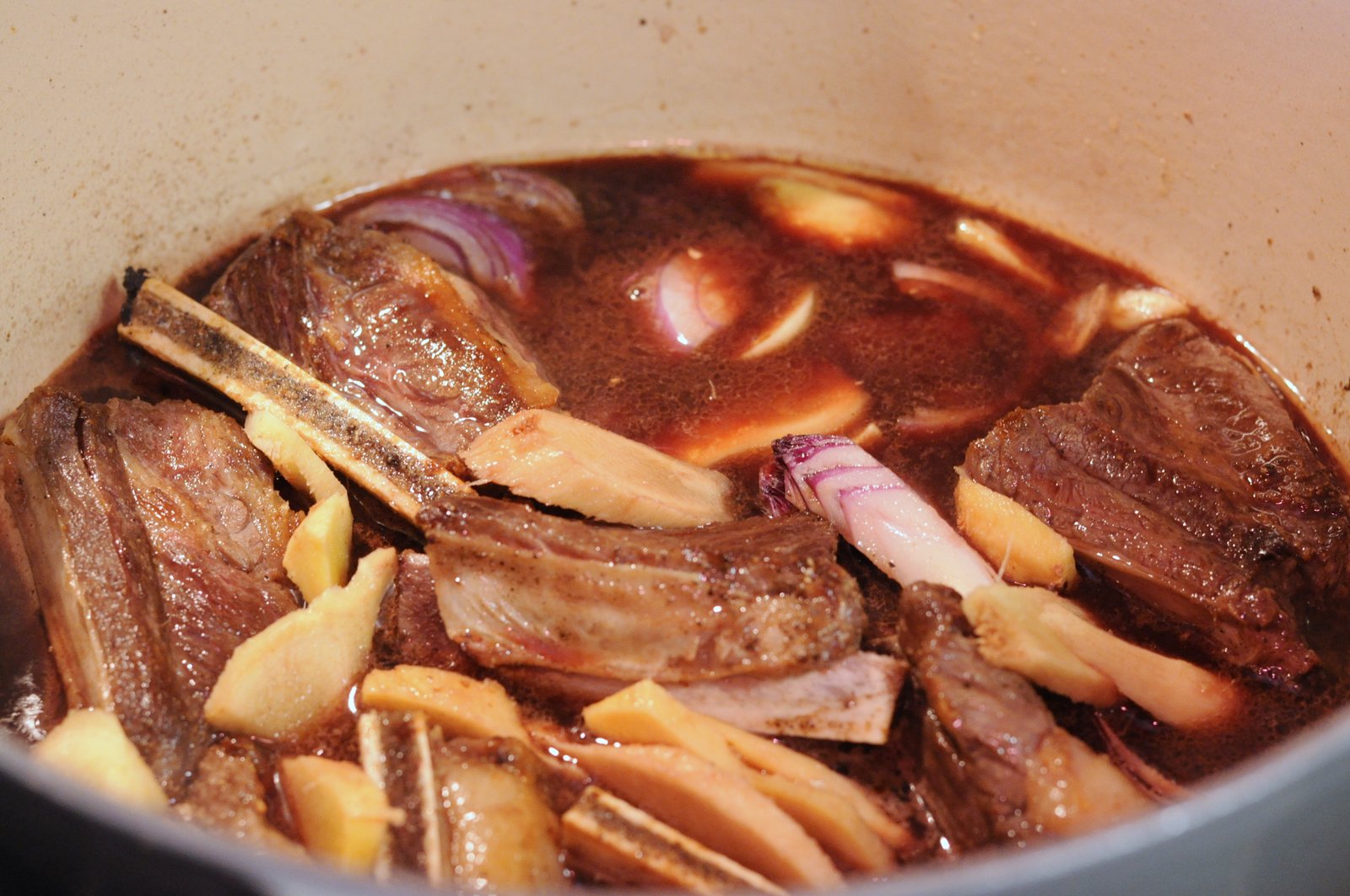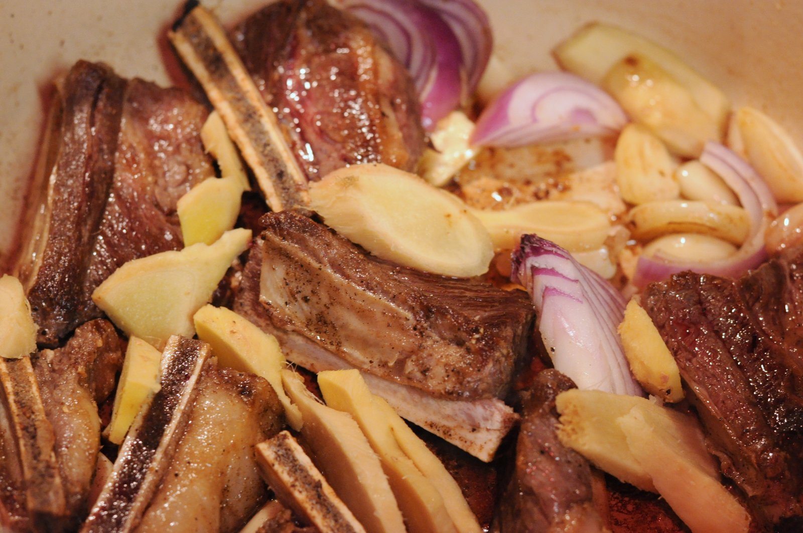 Sear meat on all sides on high heat until brown. Stir in garlic, ginger and onion, then saute until soft. Add wine, soy and sugar and simmer on low, covered for about three hours or until tender, stirring occasionally.