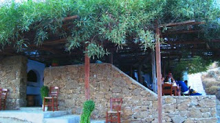There is only one source of food and refreshments bathrooms in the whole of Agios Sostis, and that is the infamous Kiki’s Taverna, where the line is long but you can drown your impatience in a dented copper-plated pitcher of white wine, handed to you with a couple of shot glasses whose authentic feel matches only the Greek chatter of locals waiting for their turn to be seated.