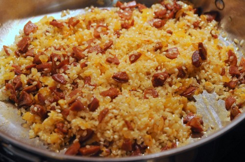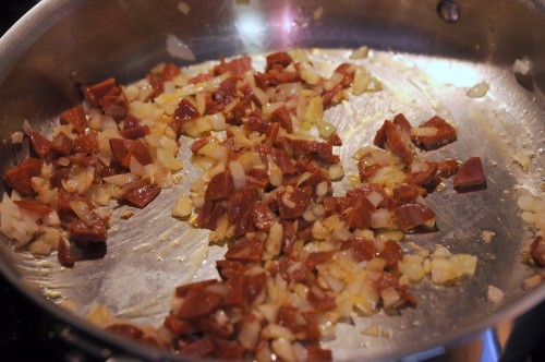 Cooking begins by using a nice, deep and flat-bottomed pan, ideally a paellera but a good solid pan will do. Garlic, onions, saffron and chorizo are sauteed until cooked and the colors are released into the oil.