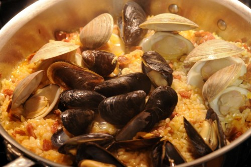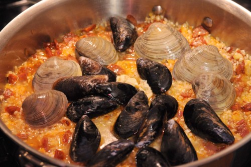 When the rice has absorbed the oil and color, you may add the clam juice or broth, as well as the clams and mussels. If using fish and shrimp, you may add those later because they take a shorter time to cook.