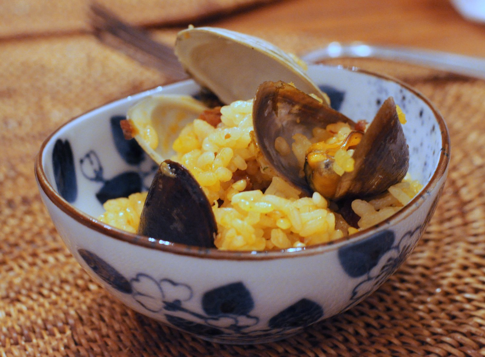 In a deep pan or paellera on medium heat, saute garlic, onion and chorizo until the oil is colored by the sausage. Add the safrron and rice and mix well until the rice absorbs the oil and the color. This is a key step that allows the flavors to seep into the rice as in my arroz caldo recipe. When rice is fully coated, add 1 cup of broth or clam juice and the mussels and clams (fish, shrimp or scallops should be added later, if using chicken, it should be browned along with the garlic and the onions). Simmer rice mixture on low heat for about 20 minutes, covered, mixing every few minutes to prevent the bottom from burning. When the rice has turned opaque and almost al dente, simmer uncovered, adding broth 1/2 cup at a time if necessary, for another 10 minutes or until al dente. It should not need any extra seasoning but you may add salt and pepper if necessary. A little bit of sauce left in the bottom of the pan will evaporate and keep the rest of it moist. Serve promptly.