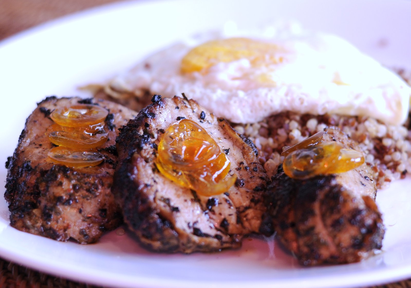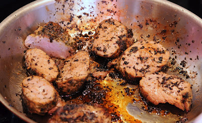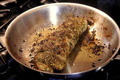 I was able to get a tender and juicy pork tenderloin at the Food Coop that was less than one pound. It was less than two quarters’ width at its thickest and seemed like it would be perfect as a pan fried pork loin. I really enjoyed the flavor of my chimichurri chicken so I decided to use the same rub for the pork loin.