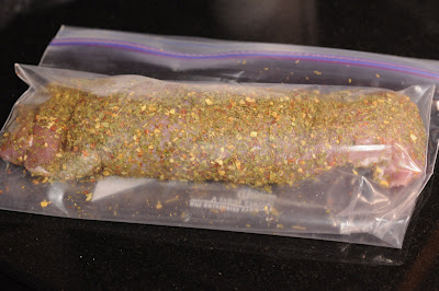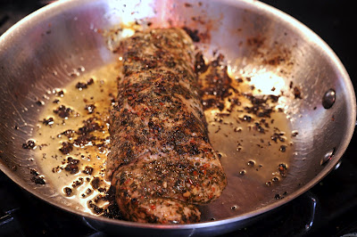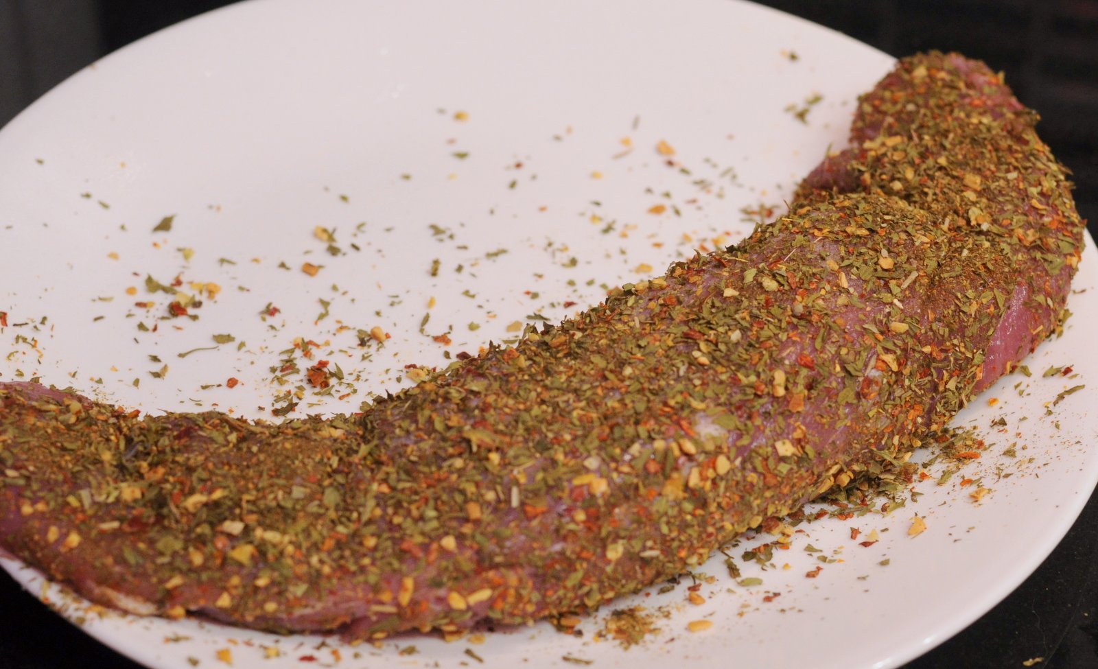 I first salted the meat and then rubbed the herbs all over the pork loin.