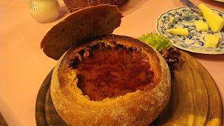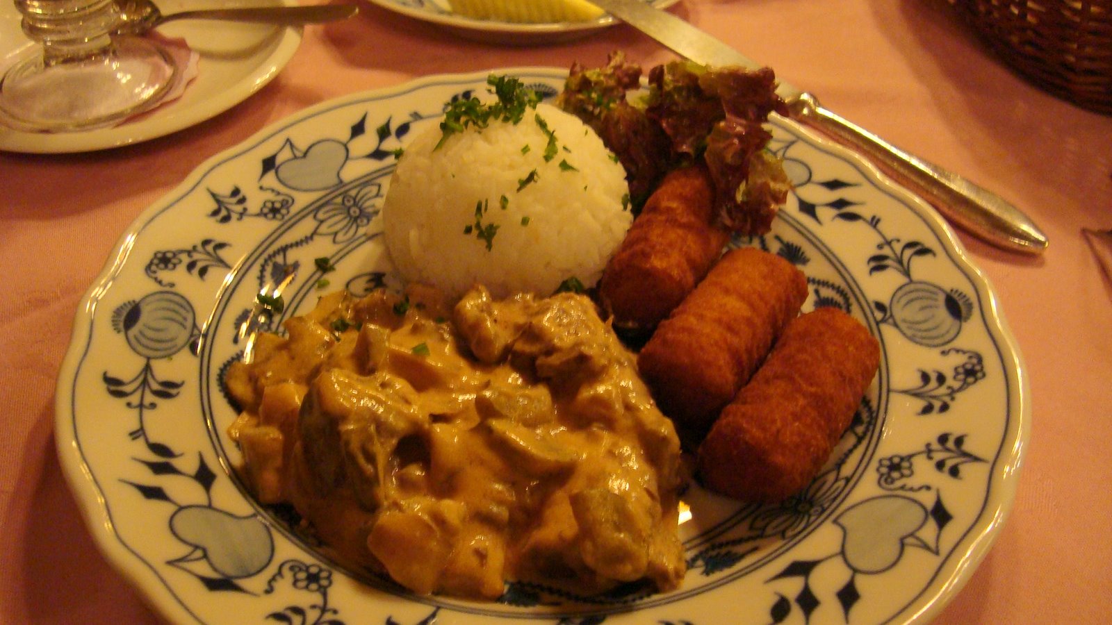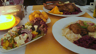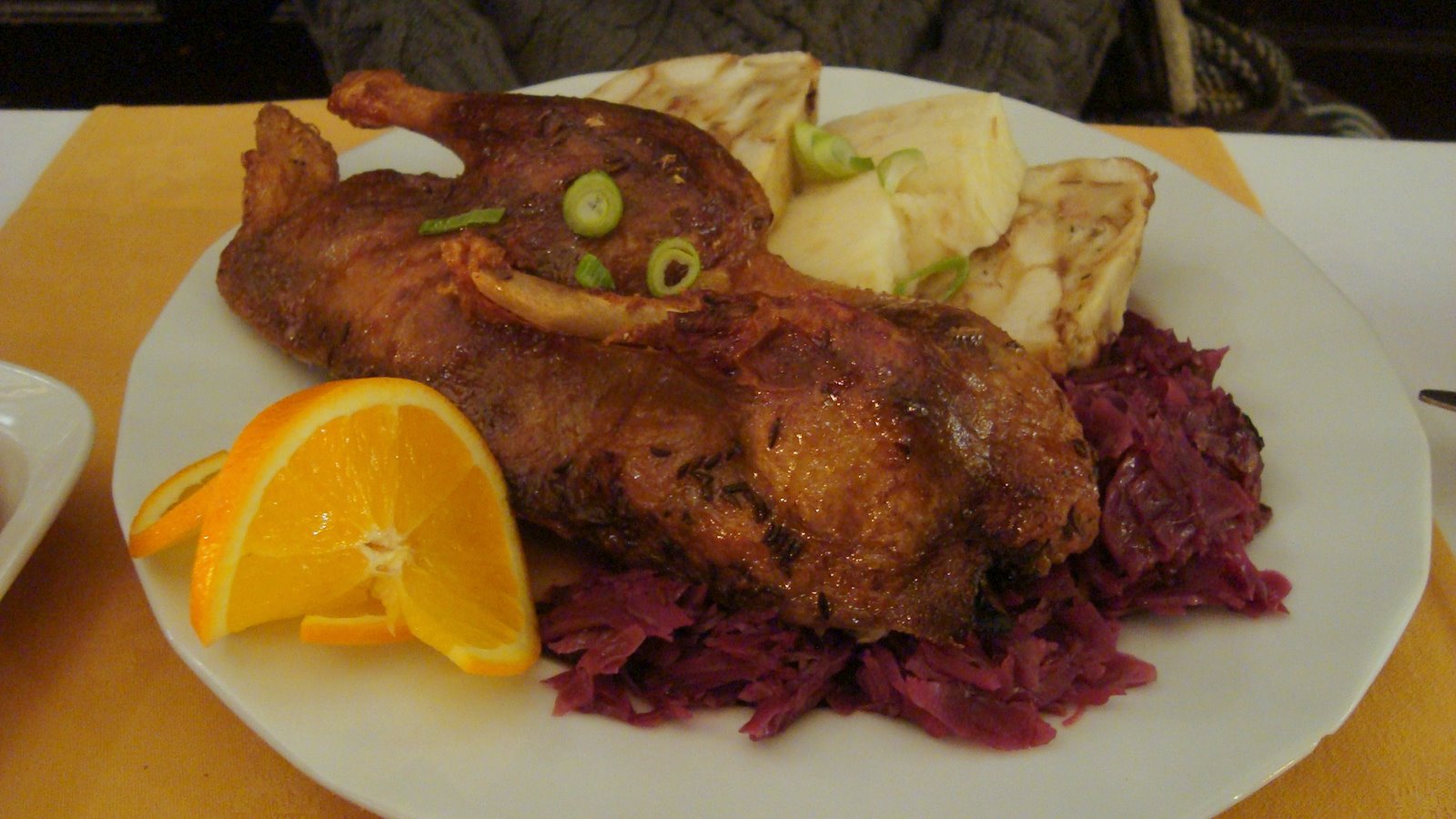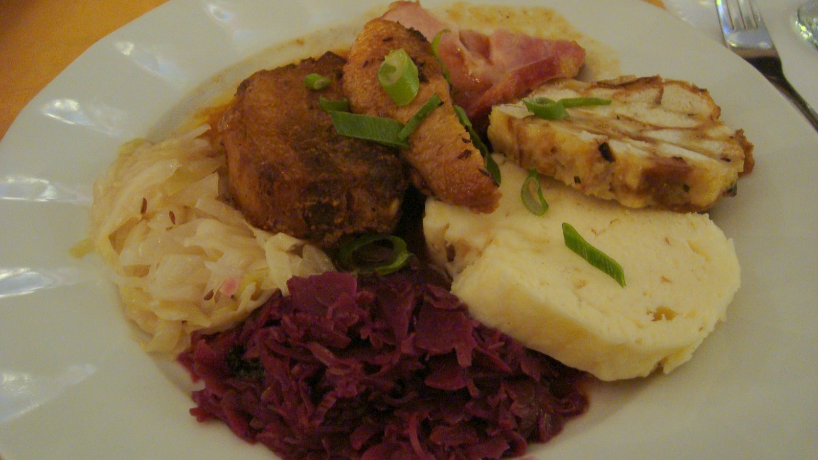 Roast duck breast, ham, pork knuckle with cabbage and dumplings.
