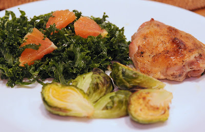 Here I served it with baked brussels sprouts (coated in olive oil and rock salt, 350C for 20 minutes), and baked chicken pieces (marinated in lemon, salt and pepper, baked at 400C for 45 minutes).