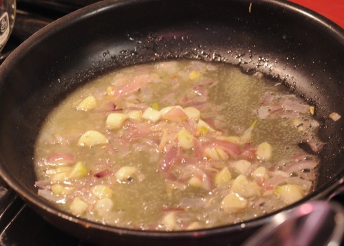 It was fun to play with the salmon’s pretty color and combine it with the earthy color of roasted pine nuts and the striking green of parsley. We began by sauteing garlic and onions and simmering a quarter cup of white whine and some lemon juice. Lemon rind was added for additional zest.