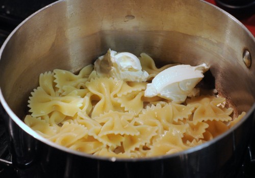 We added two tablespoons of cream cheese and mixed it with freshly cooked pasta of our choice (farfalle).