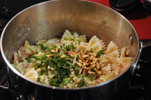 The pasta is light, smoky and creamy with the nice accents of parsley and the nuttiness of the pine nuts.