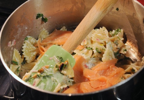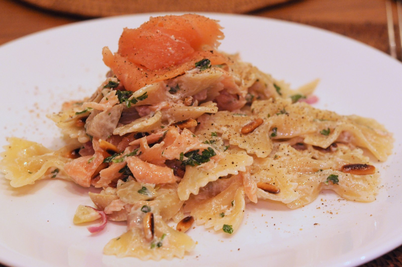 Salmon Lox Pasta with Roasted Pine Nuts, Parsley and Artichokes