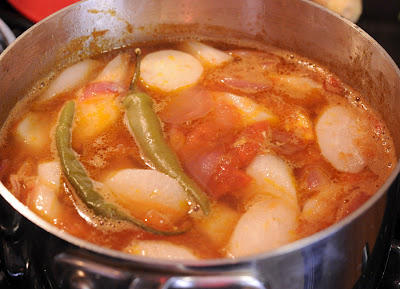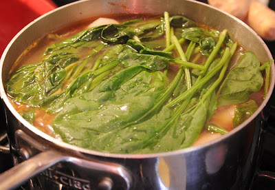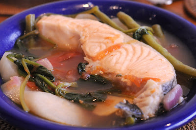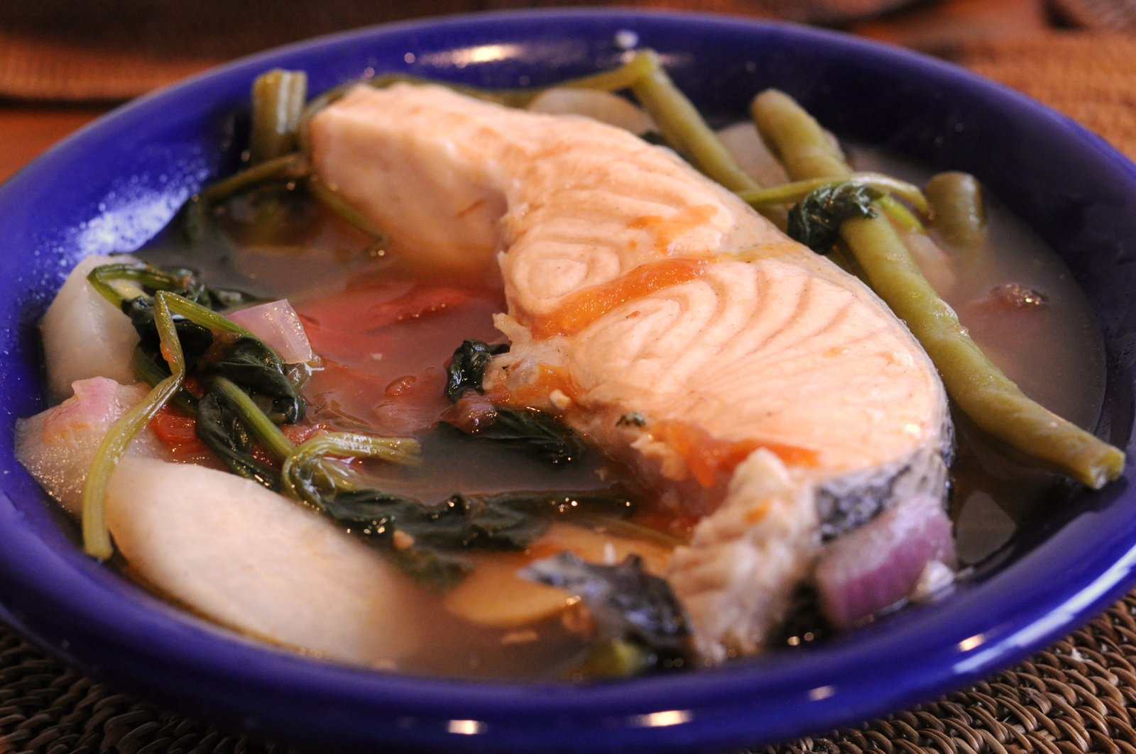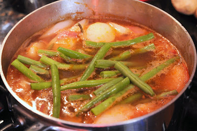 Saute ginger until brown, followed by the fish sauce, onions and tomatoes until soft. Add 6 cups water and sinigang mix. Simmer with daikon and peppers on low heat until cooked, about 15 minutes. Add string beans and simmer for ten minutes, then add fish and spinach and cook for another 5-7 minutes. Serve hot with rice. Yum! (Serves 2-3)