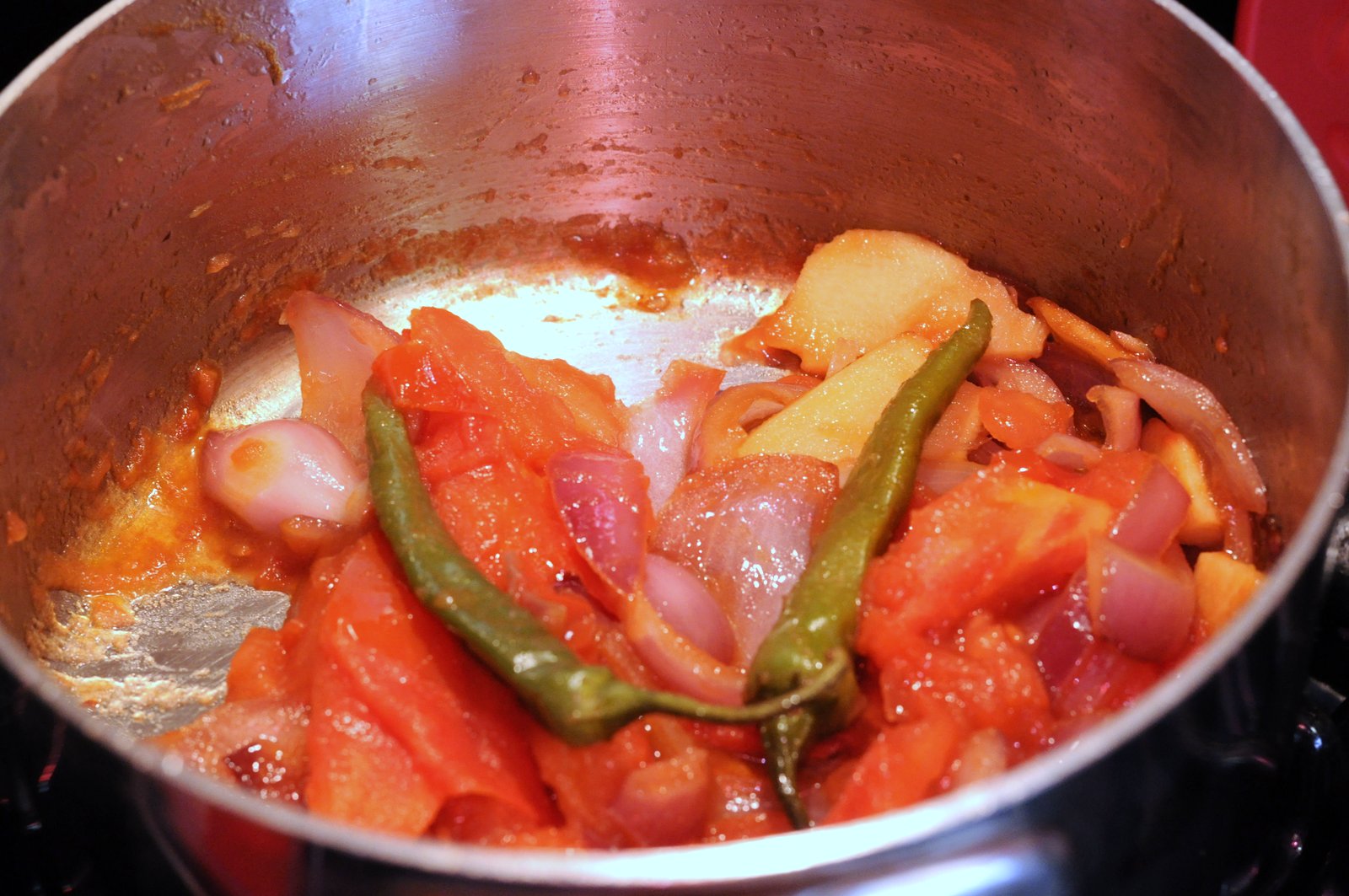 We start by sauteing ginger, onions and tomatoes until they are soft.